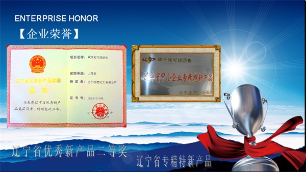 碳纖維可紡瀝青 榮獲遼寧省優(yōu)秀新產(chǎn)品二等獎、 遼寧省專精特新產(chǎn)品獎。企業(yè)為國家級專精特新“小巨人”企業(yè)、遼寧省專精特新“小巨人”企業(yè)、遼寧省高新技術(shù)企業(yè)、遼寧省創(chuàng)新型企業(yè);曾連續(xù)多年榮獲遼寧省守合同重信用企業(yè);遼寧省民營經(jīng)濟統(tǒng)計先進單位;遼陽市高成長性20強企業(yè)、五一勞動獎狀。